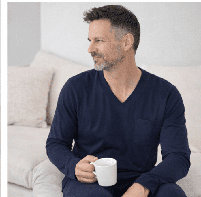 Bombažna pižama je odlična izbira za miren spanec. Materjal je zračen, kar omogoča koži, da diha. Kroj je raven z žepom in V-izrezom na zgornjem delu, za klasičen moški videz.