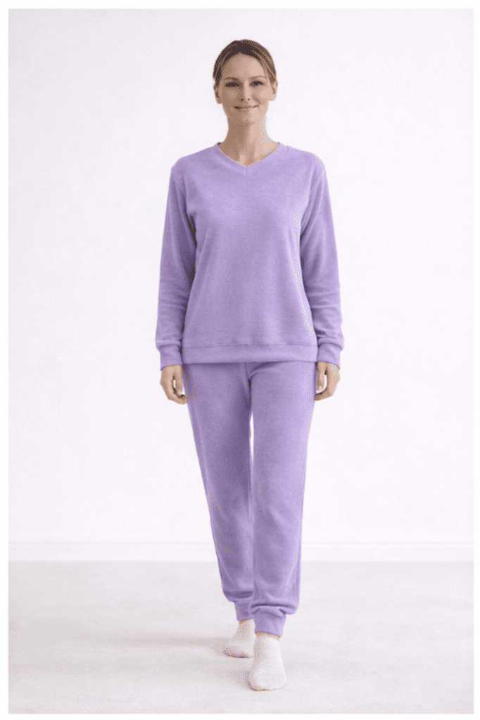 Žensk pižama iz frotirja je odlična izbira za hladnješe dni in sproščene večere doma. Izdelana je iz turškega frotirja, ki slovi po svoji kvaliteti in trpežnosti. Pižama ima patente na nogah, rokah in v pasu.